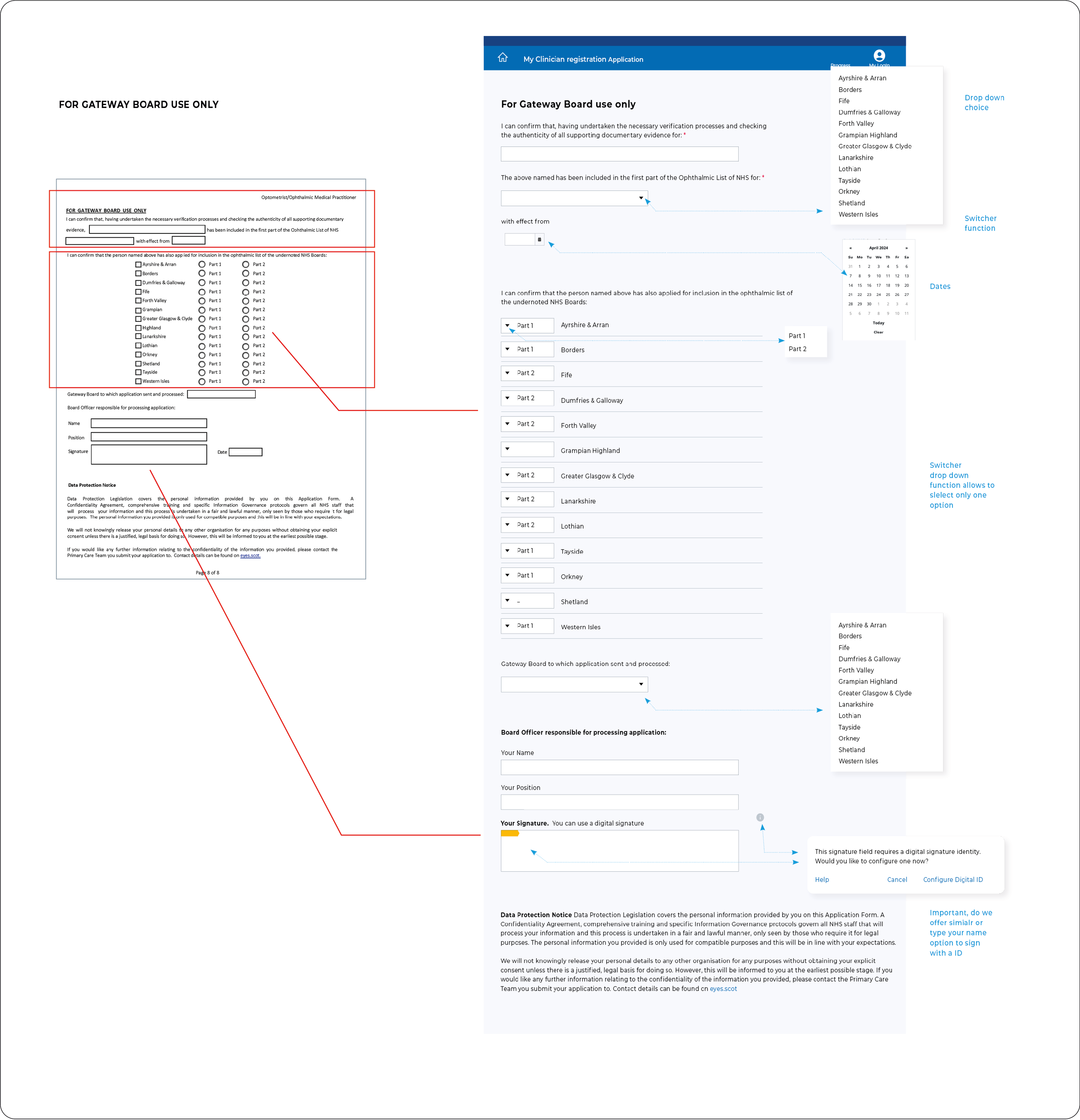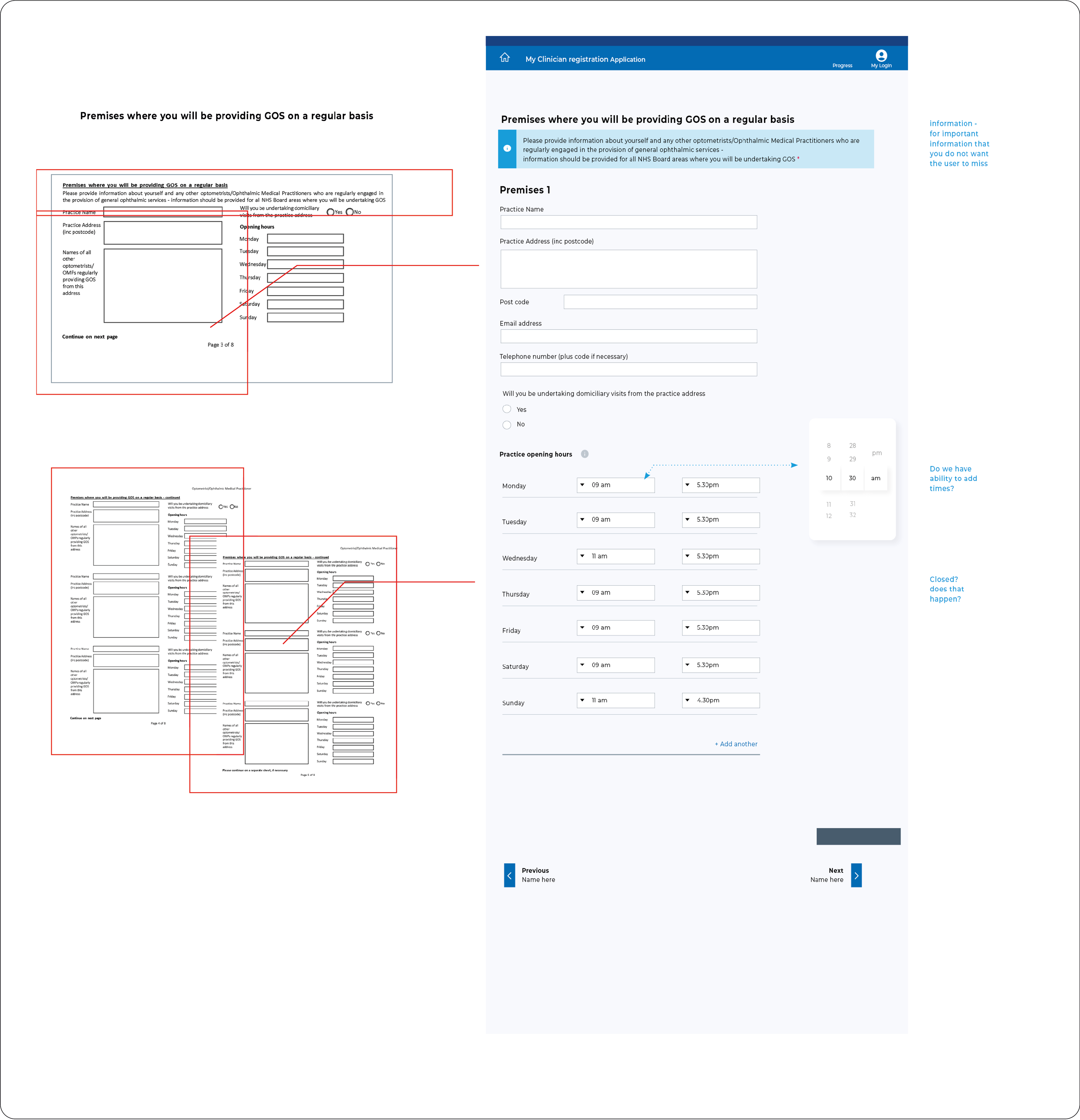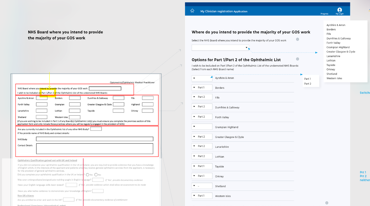 Redesigned a complex legacy system using GDS principles. Eliminated redundant PDF forms and repetitive data entry through red-line analysis, reducing completion time and improving user experience.